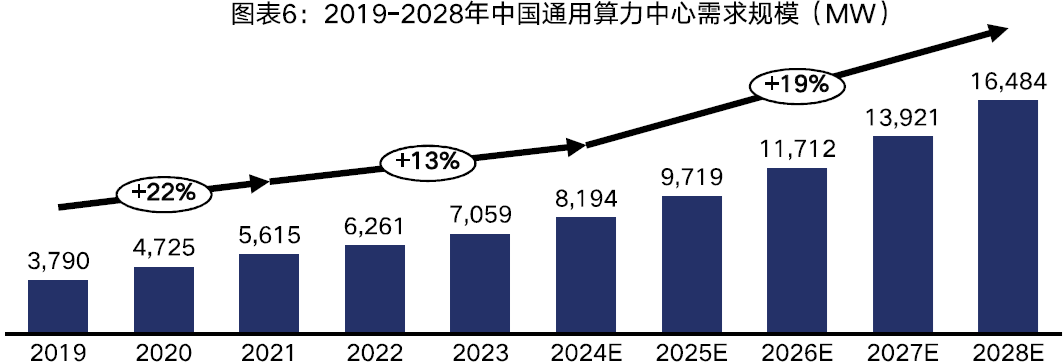 科智咨询预计中国通用算力中心需求规模在 2028 年将达到 16,484 MW,2024-2028 CAGR 为 19%.