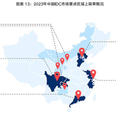机房平均上架率 56.4%,整体存在供需失衡问题。各重点区域角度,京津冀以 76% 的上架率排名最高。