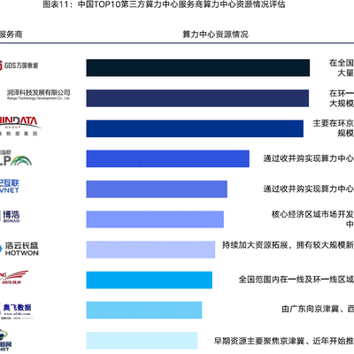 截止到 2023 年底,中国具有自有产权的第三方算力中心服务商 654 家。附图是科智咨询根据算力中心的资源情况,评选的 Top 10 第三方算力中心服务商的列表。