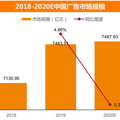 来自天风证券的研究,中国 2018~2020 的广告市场规模总体在 7,000~7,500 亿左右。