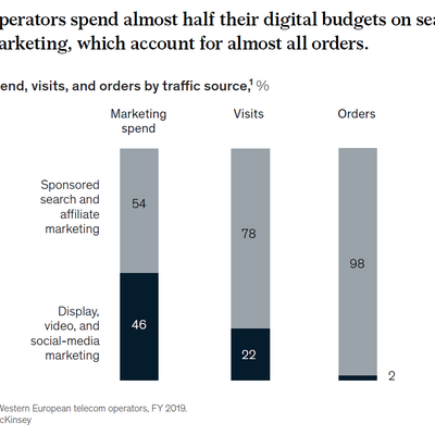 麦肯锡的一项研究提及其针对欧洲二十个运营商的线上营销进行了数据分析。观察不同营销手段在预算使用、访问量和最终订单的差别。