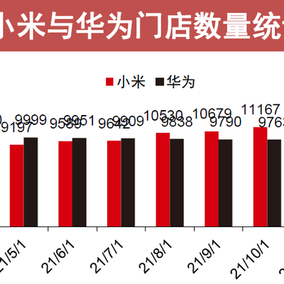 根据中信证券的研究,截止到 2021 年底小米一共有 11,929 家线下门店(含服务网点、授权店和小米之家);华为一共有 9,552 家门店。