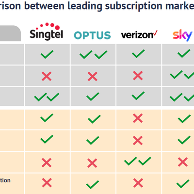 附图是 STL Partners 归纳了的代表性国际运营商的 Marketplace 订阅服务能力的对比。