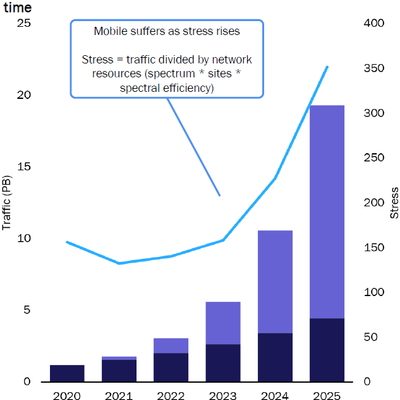 Analysys Mason 的一项研究显示(下图),如果某个网络的负载在 2021-2023 状态,5G 移动网络容量存在空闲,此刻用来发展 5G FWA 是很合算的,因为复用了移动业务的 CAPEX 和 Opex,可认为是零成本。