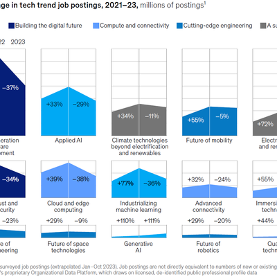 Mckinsey 对互联网上的代表性新兴技术的招聘帖进行了大数据分析。除了生成式 AI(Gen AI)之外,几乎所有罗列的方向的招聘帖数量均有下滑。