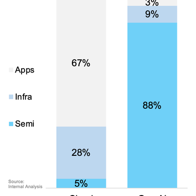 云计算 67% 毛利润来自应用层,28% 来自云基础设施层,只有 5% 来自半导体。