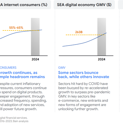 根据贝恩咨询的研究,2024 年东南亚地区的电子商务交易额(GMV)达到了 2,630 亿美元,2022-2024 一直保持在两位数的增长。数字经济(不含互联网金融)的收入也达到了 890 亿美元,同比增长 14%。