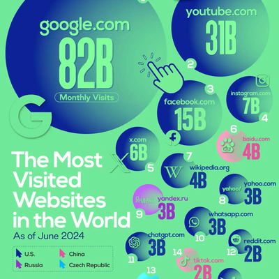 Similar Web 监测数据显示,google.com、youtube.com 和 facebook.com 是全球访问量最大的网站(2024年6月)。