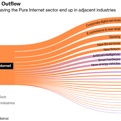 Bloomberg 基于脉脉职场数据,归类了 “纯互联网” 行业的人才转型去垂直行业的领域分布。