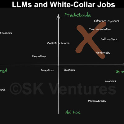 风险投资公司 SK Ventures 绘制了一张图,试着归纳 ChatGPT 背后的大语言模型(Large Language Model,LLM)后续对白领职业的影响。