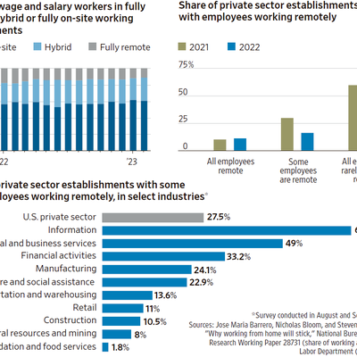 WSJ 一篇文章提及,随着疫情过去,要求全职现场办公的雇主比例越来越高。根据美国劳工部的调研,2021 年有 60.1% 的企业要求现场办公(极少或者几乎不远程),而这个数字在 2022 年提升到了 72.5%。