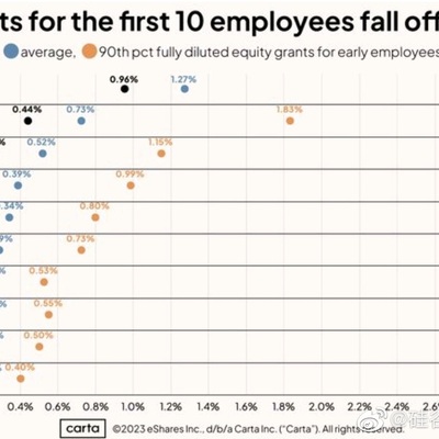 根据 Carta 公司的研究,按中位数计算,创始人之外的第一名员工可以拿到 0.96% 的股权,而第十名可以拿到 0.08% 的股权。