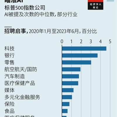 The Economist 统计了标普 500 指数公司在 2020 年 1 月到 2023 年 6 月的招聘启示,其把 “AI” 被提及次数作为统计指标。
