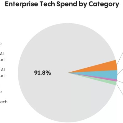Menlo Venture 的调研显示,目前 AI 相关的开支在企业所有信息技术类开支中,占比为 8.2%,其中:AI 软件 3.3%,内部 AI 专业人员薪资 3.0%,外部 AI 专业人员薪资 0.7%,AI 云端的算力开支 1.2%。