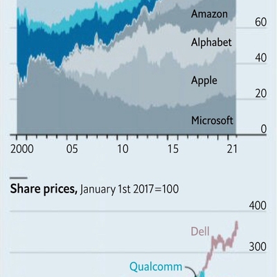 经济学人绘制了一张图表,对比了五大老牌科技公司(Cisco、高通、IBM、Dell、HPE)和互联网巨头二十年来的股价对比。