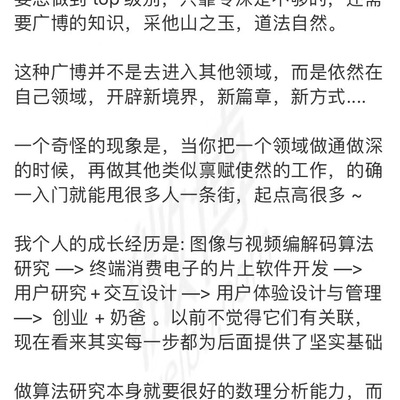 赞同作者最后对“职业发展”与“奶爸”的关联关系,深有同感;父母带给孩子的不仅是关爱照顾之类,还有几十年人生学业职业等阅历的浓缩输入,即:“虚拟阅历 / 阅历折叠”。