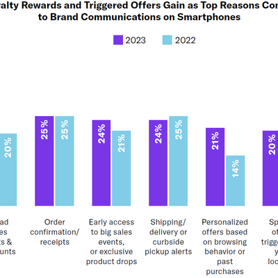 其中,“折扣和忠诚度奖励”(42%)、“针对浏览行为或过去购买的个性化优惠”(21%)和 “由当前位置触发的特别优惠”(20%)三个项目的涨幅最大,在2022年至2023年间各上涨7%。