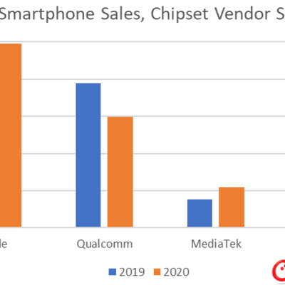附图是 Counterpoint Research 对美国智能手机市场 2019~2020 手机芯片的份额分布。Apple 自研的手机芯片占据了最大的市场份额,差不多有 50% 了。