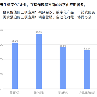 此类企业在组织运作流程方面的数字化应用居多,最具价值的三项应用为:视频会议、数字化产品、一站式服务。