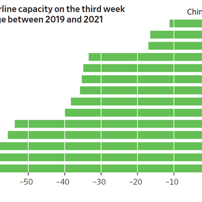 WSJ 绘制了一张图,对比了 2019 年 7 月的前三周和 2021 年 7 月的前三周,各国航班量是增还是减。