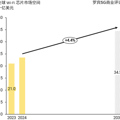 2023 年全球 Wi-Fi 芯片市场规模超过 210 亿美元,Fundamental Business Insights 预计到 2033 年芯片规模可达 345 亿美元,2024-2023 的年复合增长率 CAGR 可达 4.4% 以上。