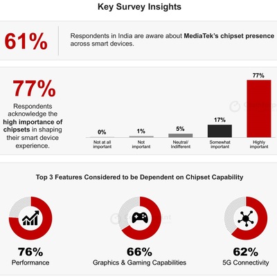 Counterpoint 在印度的消费者调研显示,消费者在选购时会看重手机中芯片组的构成。有高达 77% 的消费者认为芯片组很重要。