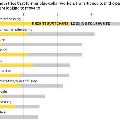根据 Oliver Wyman 咨询公司的调研,美国蓝领工人,通过技能培训之后的转行中,排名靠前的目标行业为:(1) IT / 数据处理;(2) 电子制造;(3) 软件;(4) 医疗;(5) 金融。