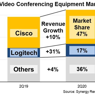 根据 Synergy Research 的数据, 2020Q2 全球视频会议设备销售收入同比 2019 增长了 11%。Cisco 占据了 47% 的份额,同比增长了 10%。Logitech(罗技)的增幅达 31%。笔者周围很多人购买了安装在笔记本电脑上的罗技摄像头。