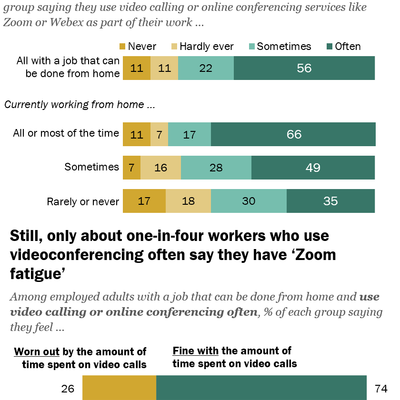 疫情以来,Zoom 作为热门的视频会议工具被广泛使用。Pew Research Center 的调研表明,美国公司雇员中有四分之一觉得自己有 “Zoom Fatigue 疲劳”。