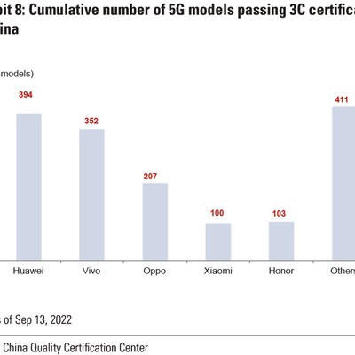 高盛基于中国质量认证中心 3C 认证的数据,统计了主要品牌 5G 终端设备款型的品牌分布。