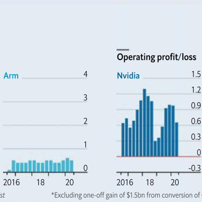 Nvidia 向 ARM 发出收购要约,经济学人的一张图对比了两家公司营收和利润情况。