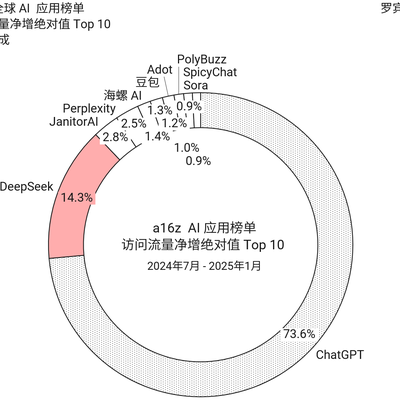 风险投资机构 a16z 于 2025 年 3 月发布的第四版全球 AI 应用榜单中,如果把上榜产品在 2024 年 7 月到 2025 年 1月的流量净增绝对值进行排名。
