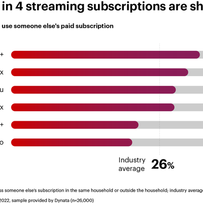 根据贝恩公司的研究显示,2022 年美国代表性流媒体平台中,平均有 26% 的人群会使用别人的账号来观看视频。