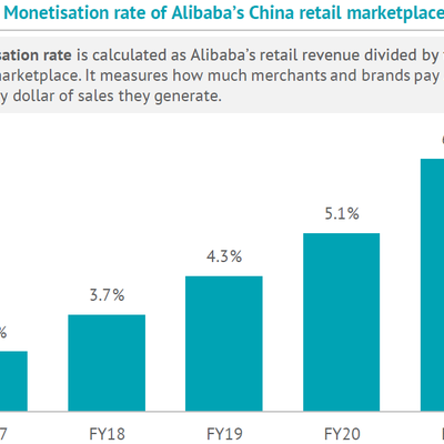 附图是 SCMP 的研究,阿里巴巴的货币化率从 2017 年的 3% 持续提升到 2021 年的 6.3%(预计),四年时间翻了一倍。