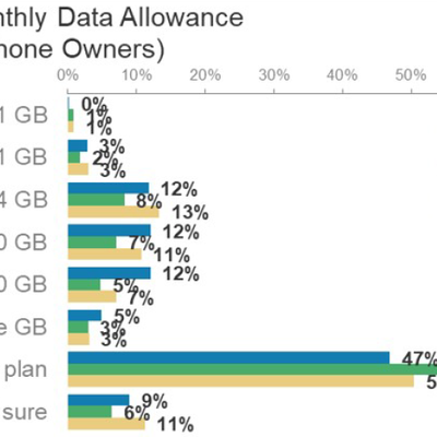 (1) 三大运营商都有一半及以上的用户选择了不限量套餐;T-Mobile 的不限量套餐最多; (2) AT&T 和 Verizon 的用户选择比例类似。