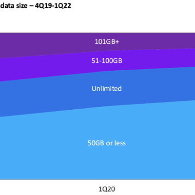 Unlimited 不限量套餐的占比保持在 23% 左右。但需注意,以美国运营商为代表的,所谓 Unlimited 其实是超过额度要限速的。