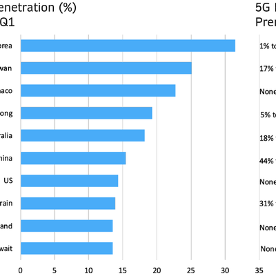 根据 OMDIA 的研究,5G 用户渗透率角度,全球 Top 10 的市场为:韩国、中国台湾、摩纳哥、中国香港、澳大利亚、中国大陆、美国、巴林、瑞士、科威特。