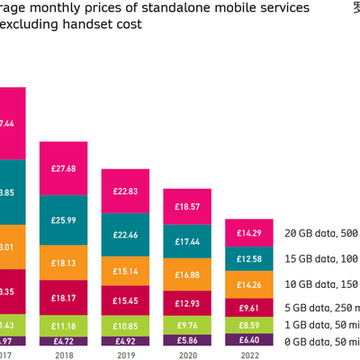 英国通信行业监管机构 Ofcom 披露了一组数据,展示了英国典型的移动业务组合的资费在过去六年的变化。