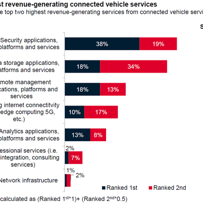 GSMA 2023 年针对通信、云服务、IoT 和汽车行业的调研,针对智能网联汽车的业务增收可能,哪些业务产生的收入最高?