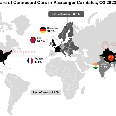Counterpoint 统计了全球几个主要汽车销售市场的网联汽车的渗透率。