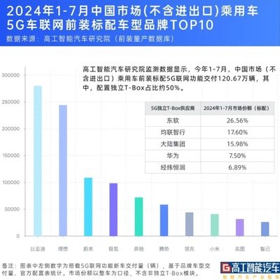 高工智能汽车研究院监测数据显示,2024年1-7月,中国市场(不含进出口)乘用车前装标配 5G 联网功能交付 120.67 万辆,其中,配置独立 T-Box 占比约 50%。