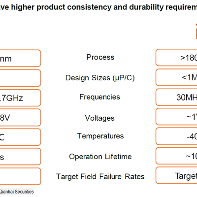 一个接近零故障率的芯片、可以适应 -40 度的芯片,可以使用 15 年的芯片。显然和手机元器件还是有相当大的不同。