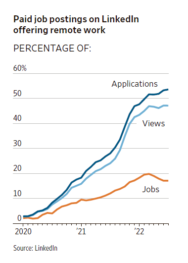 WSJ 基于 Linkedin 的数据,对比了 2020 疫情以来,围绕远程工作(Remote Work):工作职位描述、职位申请 和浏览量的变化。