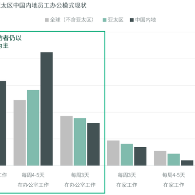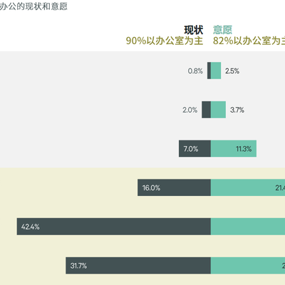 世邦魏理仕在 2022 年 11 月调研数据显示,相较于全球和亚太区,90% 的中国受访者表示目前仍以办公室工作为主,高于亚太区和全球 6 和 9 个百分点。