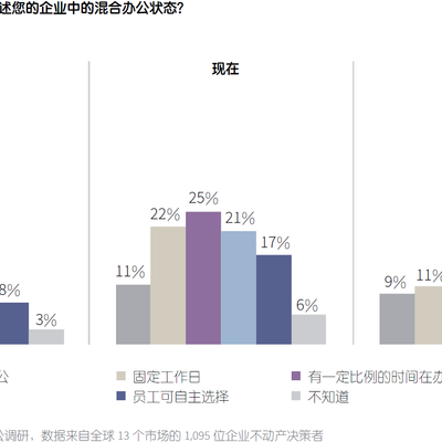 仲量联行针对全球 13 个市场的 1,095 企业不动产决策者调研显示,疫情前有 45% 的企业没有或极有限的混合办公。