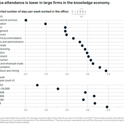 附图来自 Mckinsey,其调研了不同垂直行业和不同规模公司员工在办公室的每周天数。