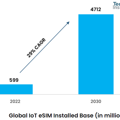 Tech Insights 的研究显示,2022 年全球蜂窝物联网设备中有 5.99 亿 eSIM 现网连接。预计到 2030 年,在网物联网连接中,有 47 亿为 eSIM 连接,复合增长率高达 29%。