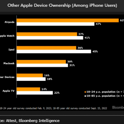 附图来自 Bloomberg Intelligence,针对美国消费者的调研。从渗透率看,Airpods(无线耳机)、Apple Watch(智能手表)和 iPad 位居互补品的前三位。