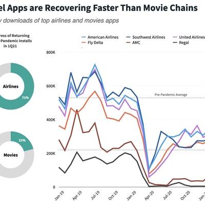 以美国市场为例,以品牌商官方 App 的下载安装量为度量,民航恢复了 71%,而电影院只恢复了 21%。
