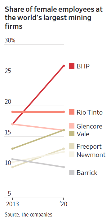 采矿算比较艰苦的行业,环境比较苛刻。附图是 WSJ 提供的一张图,展示了国际采矿巨头的女性职员比例。